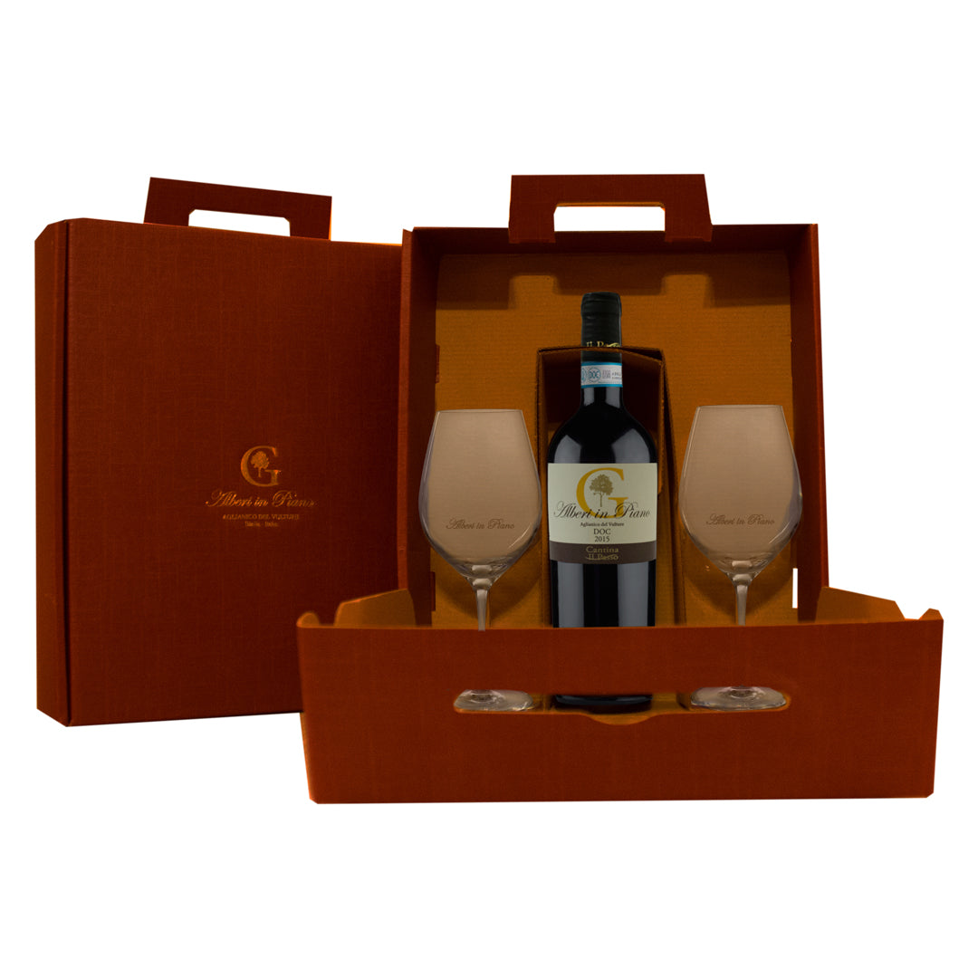 Rendi felice un vero amante del vino con questa confezione regalo con 2 Calici Serigrafati "Alberi in Piano".